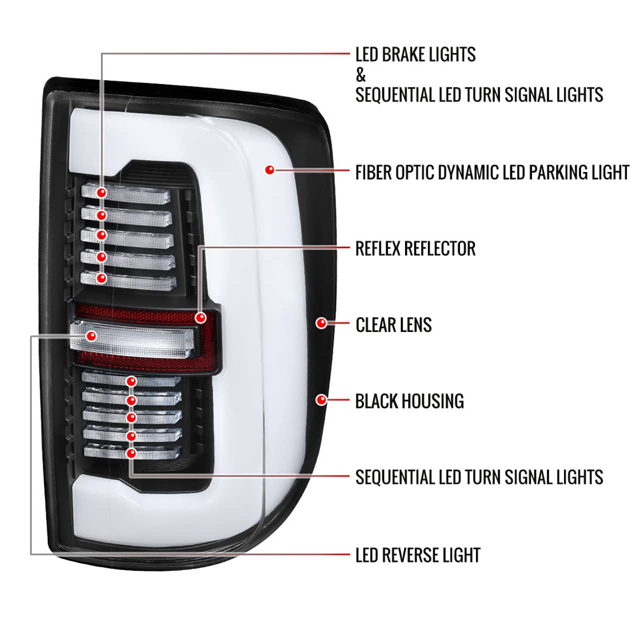 - Comes with (1) set of sequential LED turn signal tail lights in matte black housing with clear lens